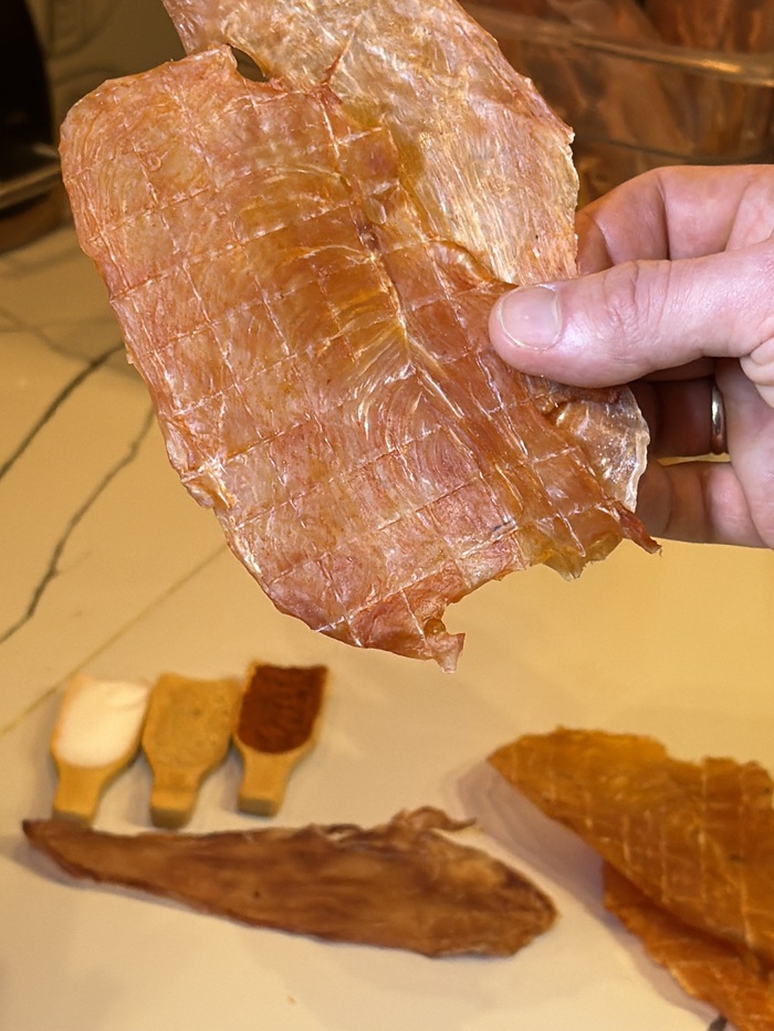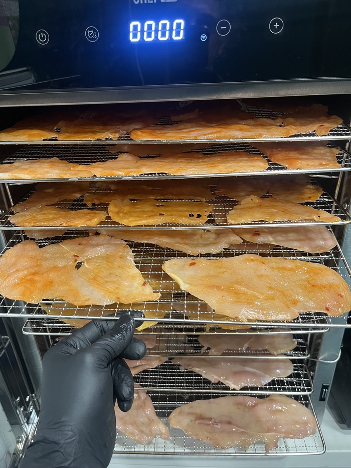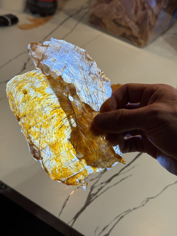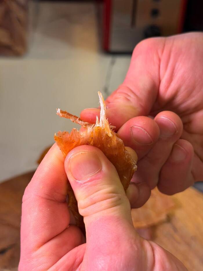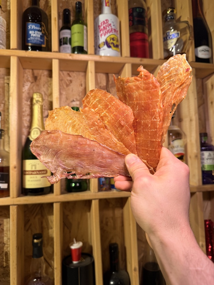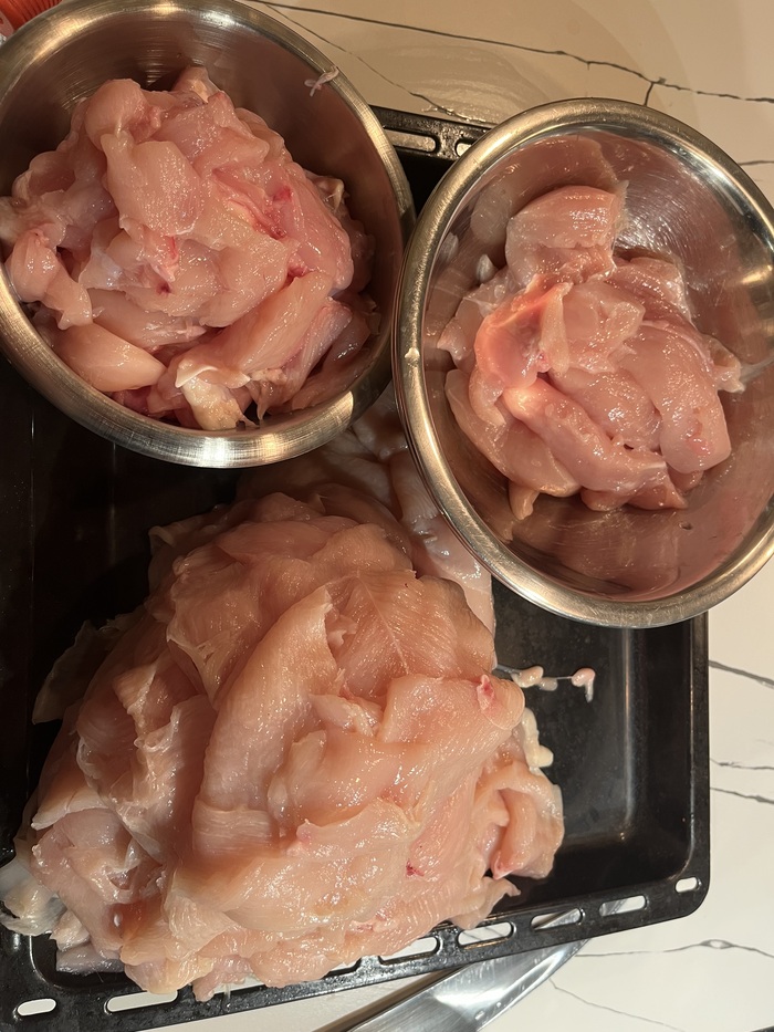 Нарезаем толщиной около 2-3 мм, не нужно нарезать толстыми кусманами.